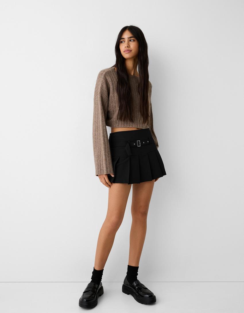 تنورة قصيرة بكسرات وقصة محبوكة وحزام