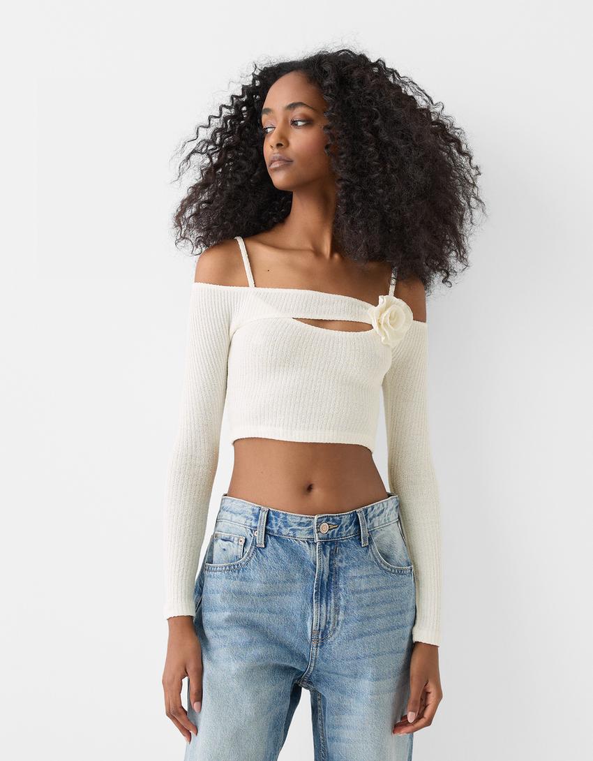 تيشرت بأكمام طويلة وتفصيل أزهار ودرزات