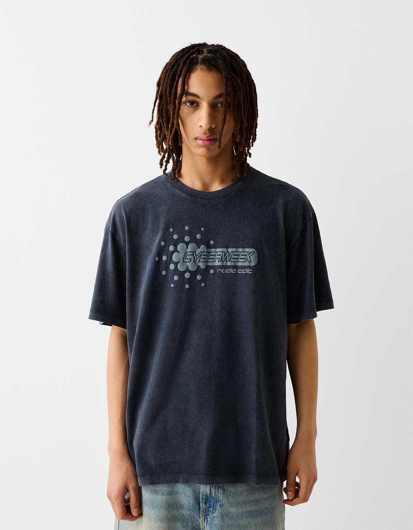 تيشرت بقصّة مربعة وأكمام قصيرة وطبعة وتأثير باهت