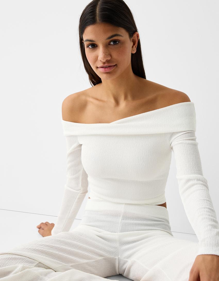 تيشرت مكشوفة الأكتاف بغرزة وافل وأكمام طويلة