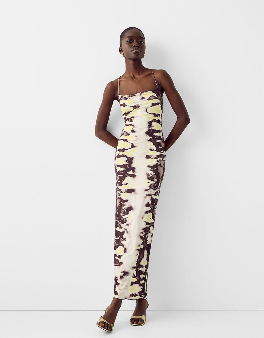 فستان متوسط الطول بحمالات وطبعة حيوانية