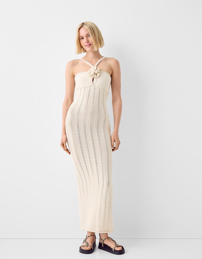فستان ميدي ريفي بتخريمات وفتحة عنق بأزهار