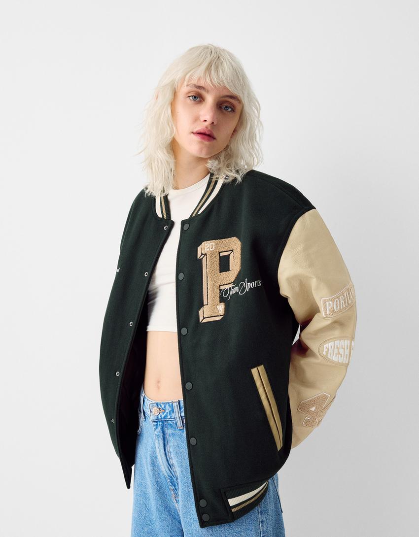 جاكيت جامعي لباد بملمس بارز وأكمام جلد صناعي
