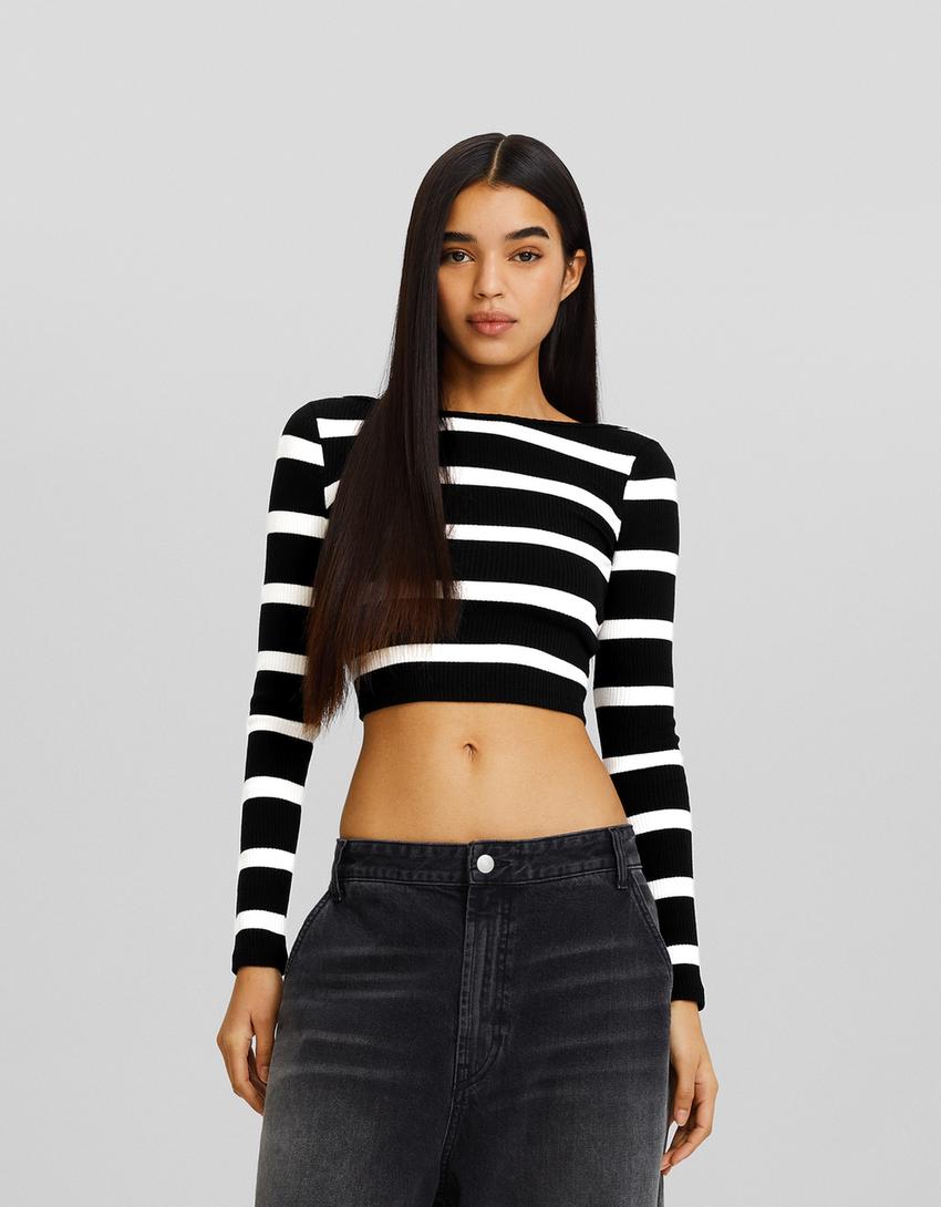 تيشرت محاك مقلّم بأكمام طويلة وفتحة خلفية