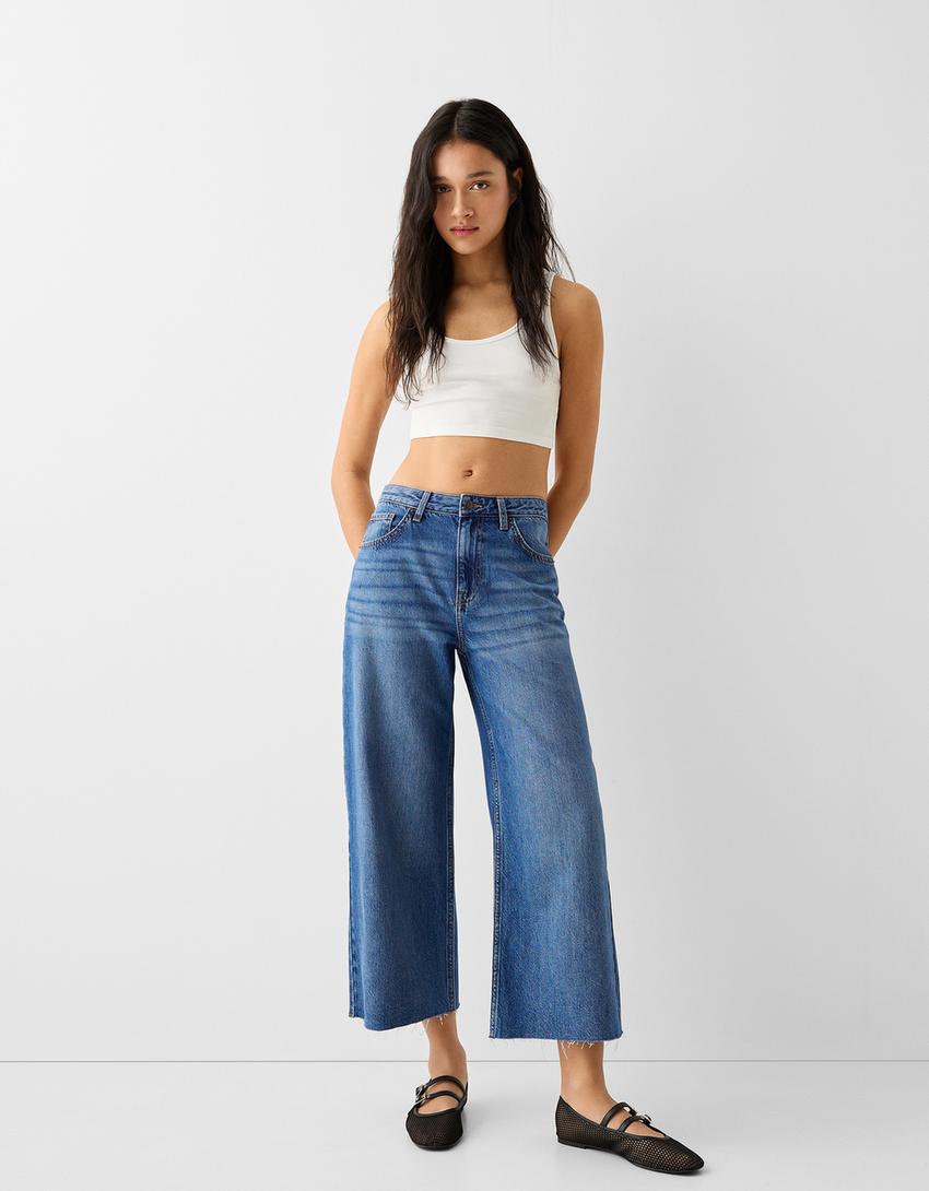 جينز بقصة قصيرة وساق عريضة