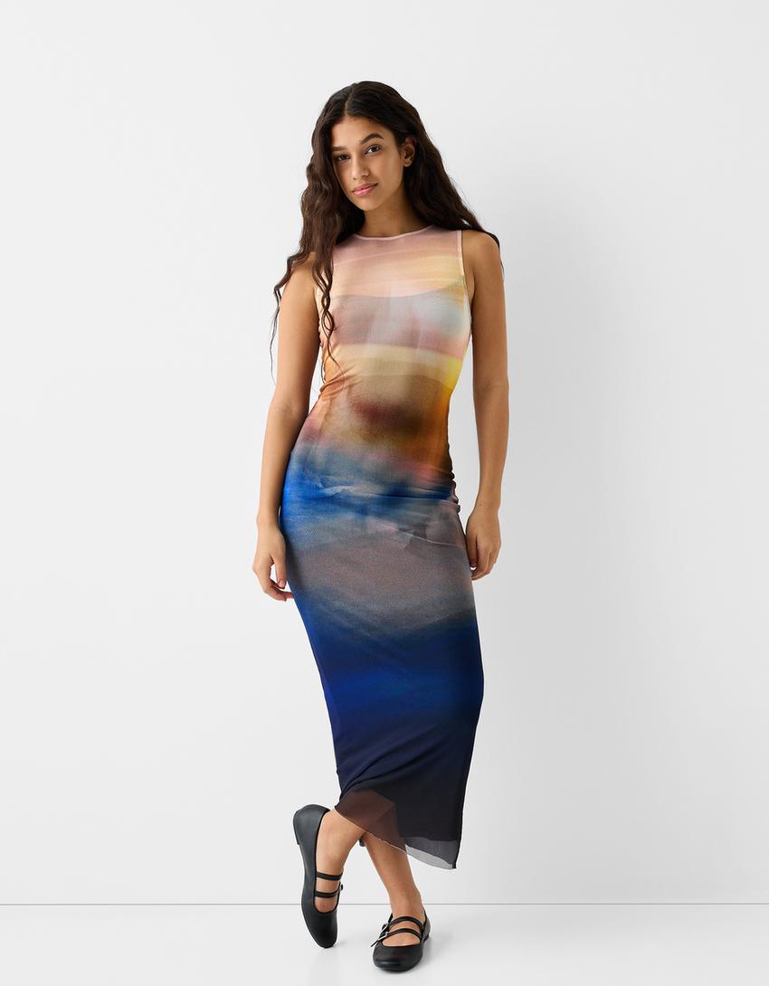 فستان تول مطبوع متوسط الطول بدون أكمام