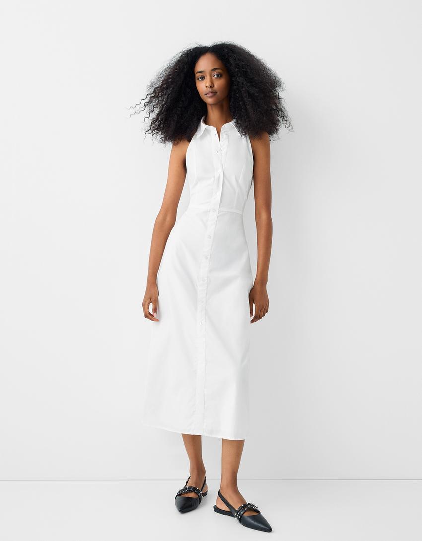 فستان ميدي هالتر بوبلين بأزرار