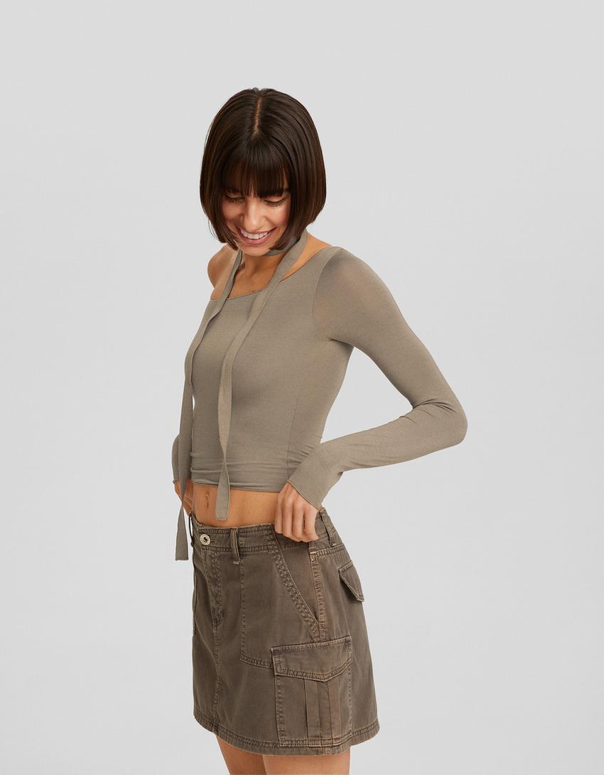 تيشرت وشاح غير متماثل بأكمام طويلة