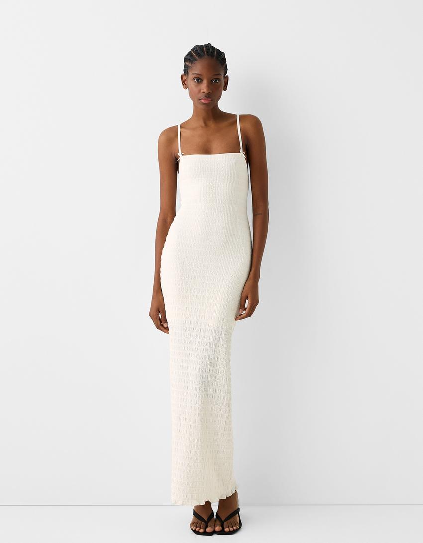 فستان ريفي متوسط الطول بحمالات وتفصيل ربطة