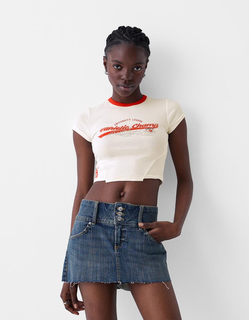 تيشرت مضلع متباين بأكمام قصيرة وأحجار الراين
