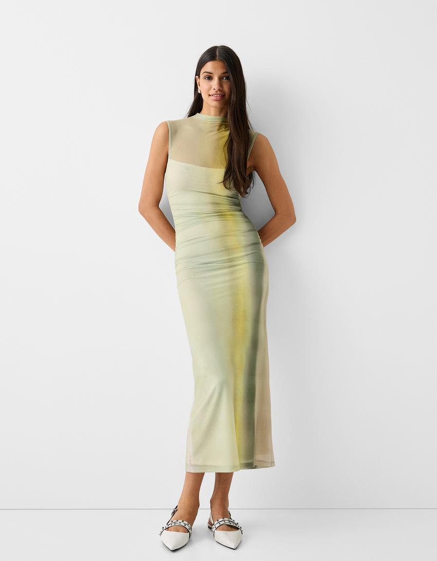 فستان ميدي يباقة عالية وأكمام قصيرة وطبعة
