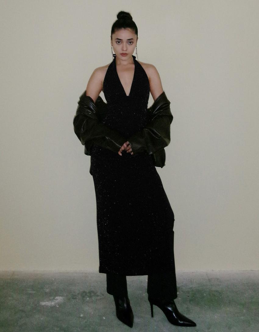 Shimmery halter neck midi dress