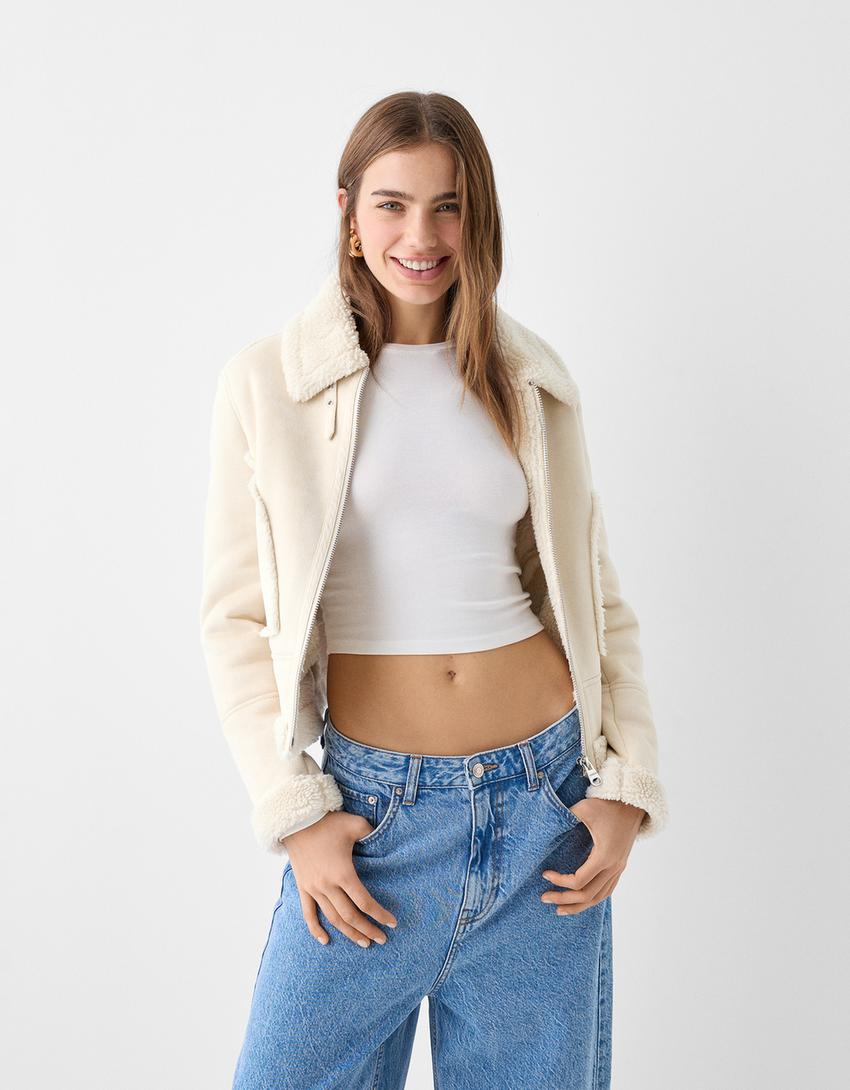 Късо яке от изкуствен велур с контрастна вътрешност
