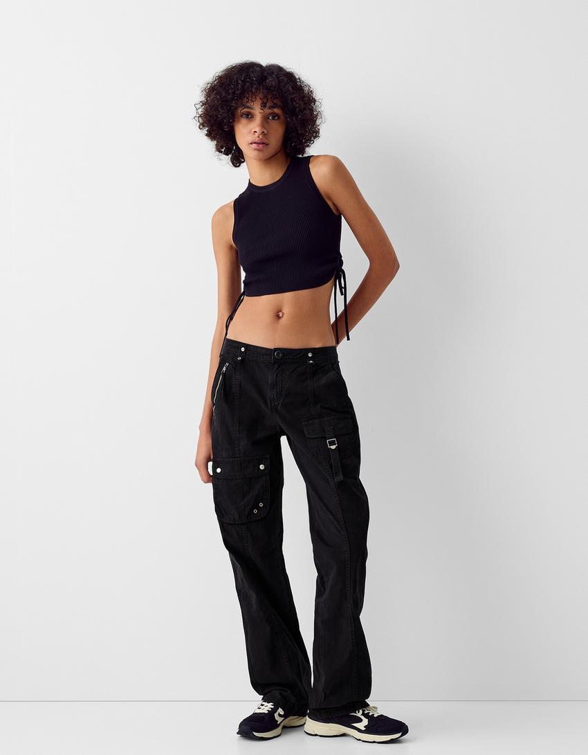 Памучен карго панталон с ниска талия и лента