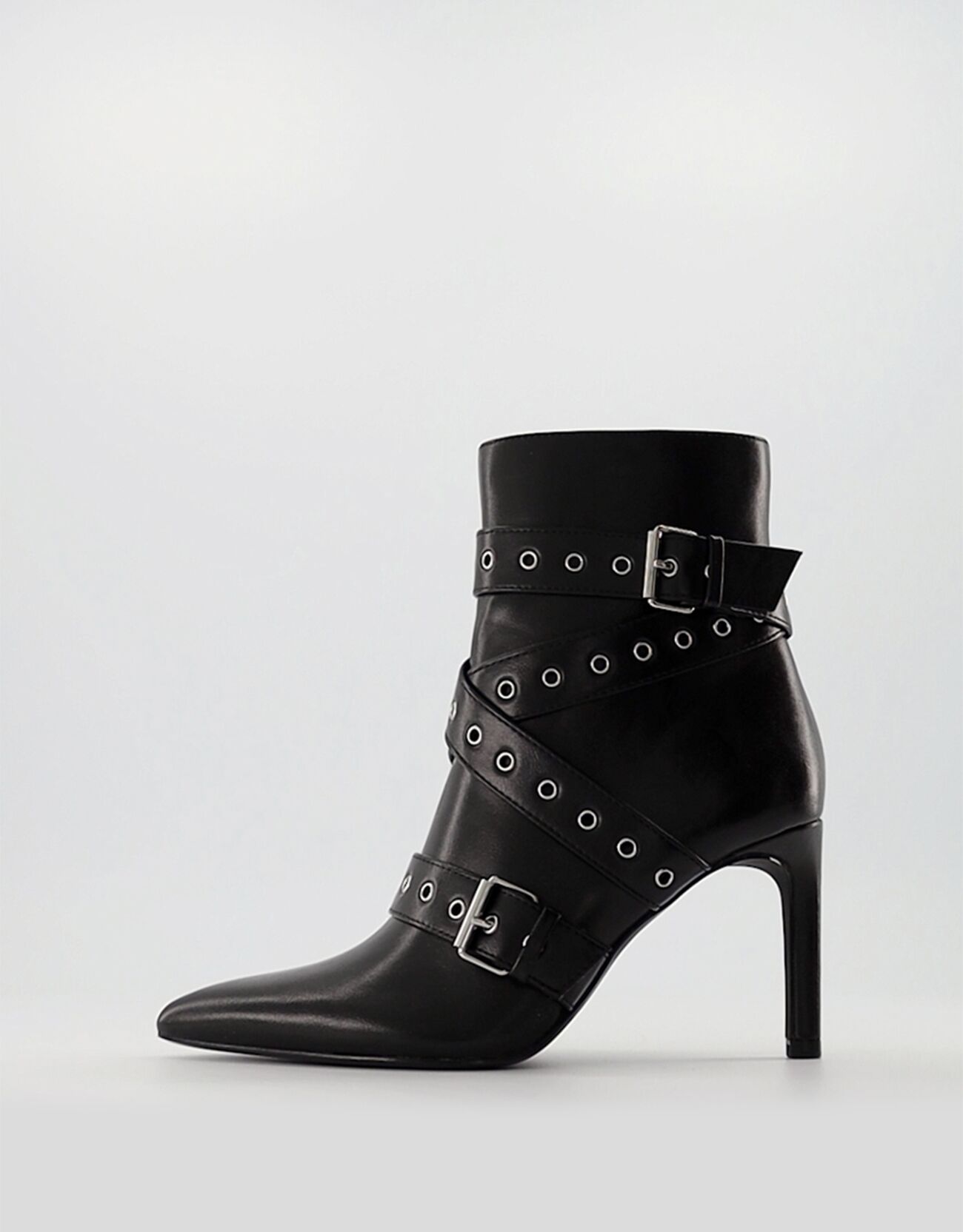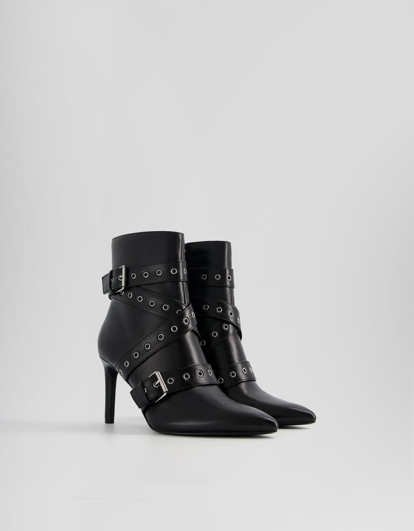 Bottines à talon aiguille avec lanières, clous et boucles