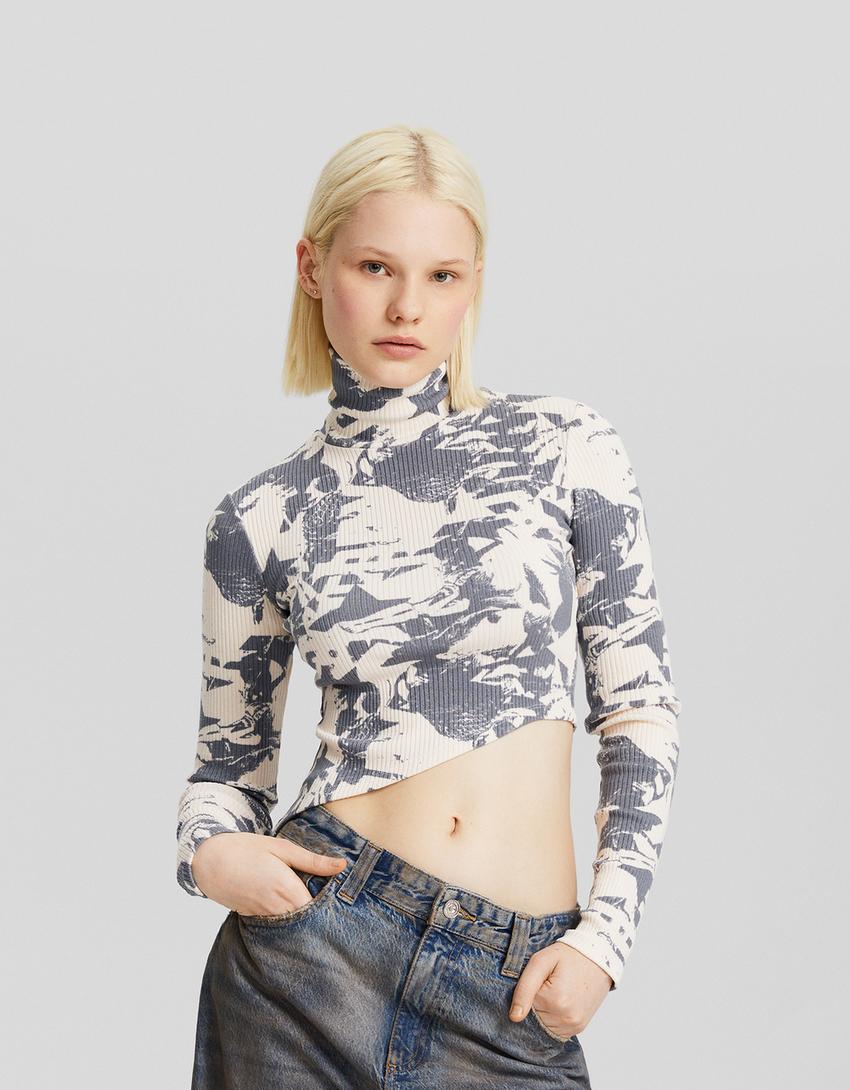 Pull col roulé asymétrique imprimé
