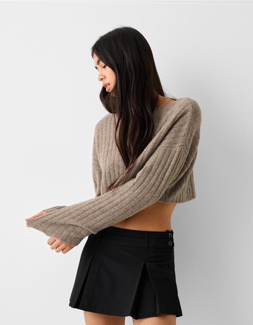 Pull cropped maille bord-côte épaules tombantes