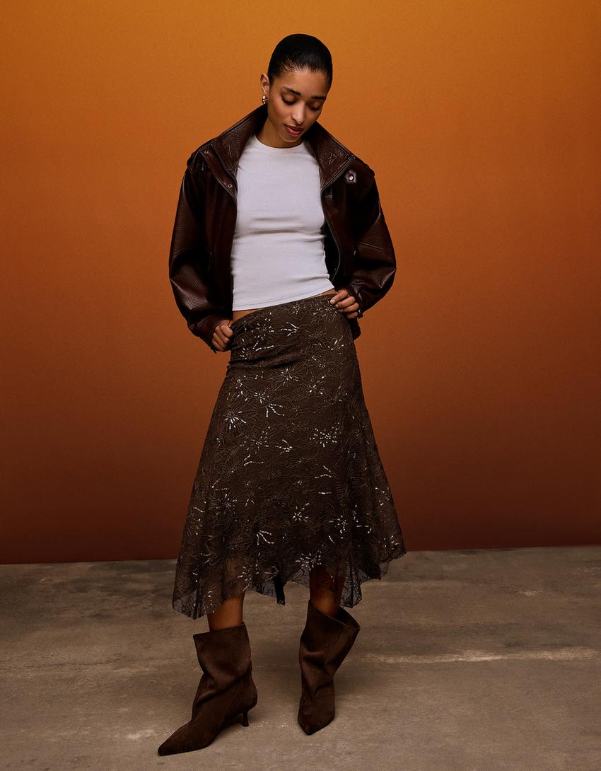 Embroidered sequin midi skirt