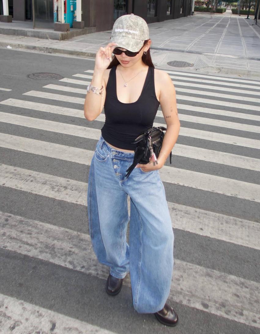 Jeans wide leg barrel taille basse à boutons front boutonné