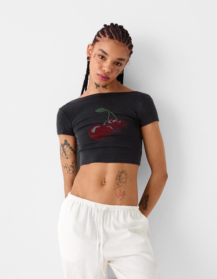 Cropped T-shirt with open back and rhinestones