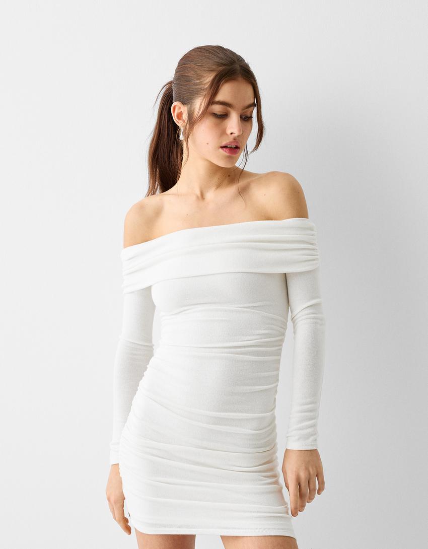 Long sleeve knit bandeau mini dress with gathering