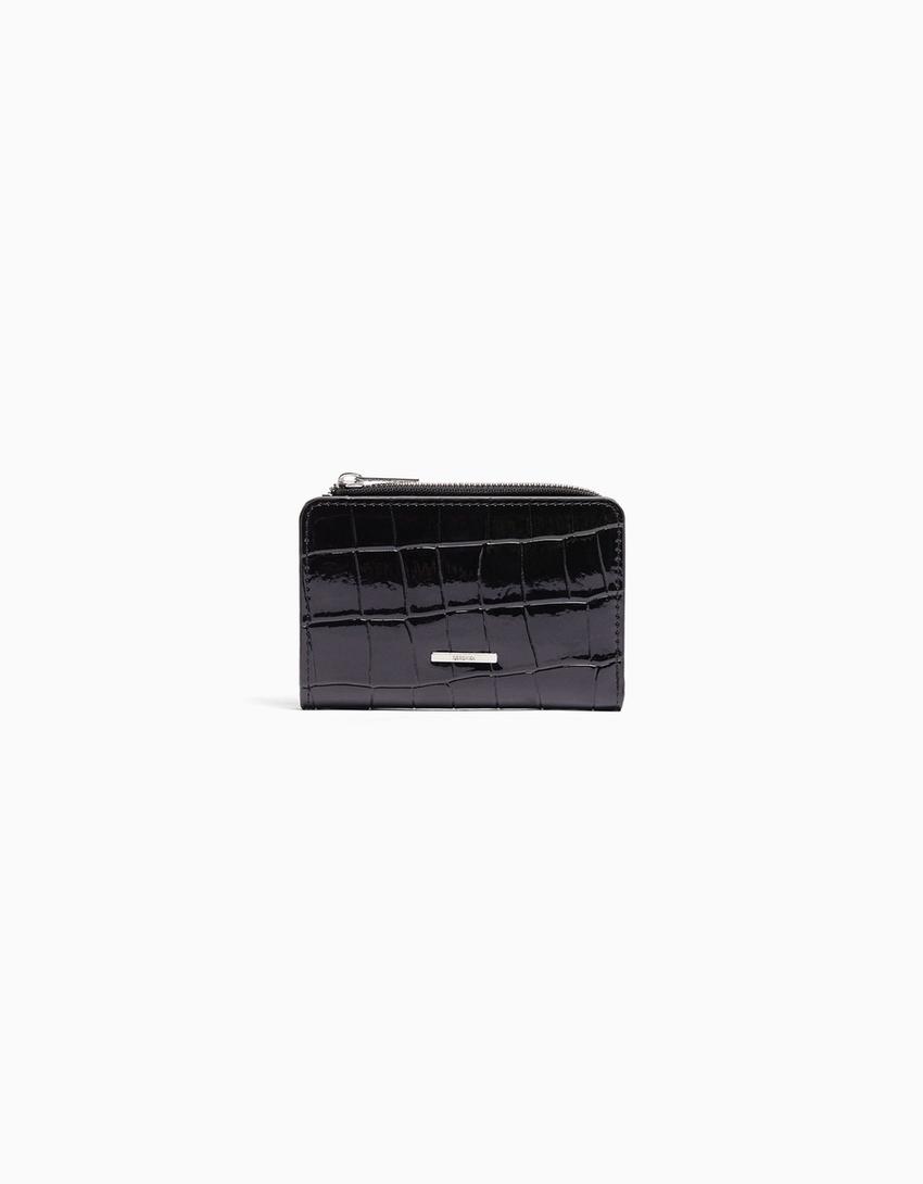 Embossed faux-patent-finish animal print purse
