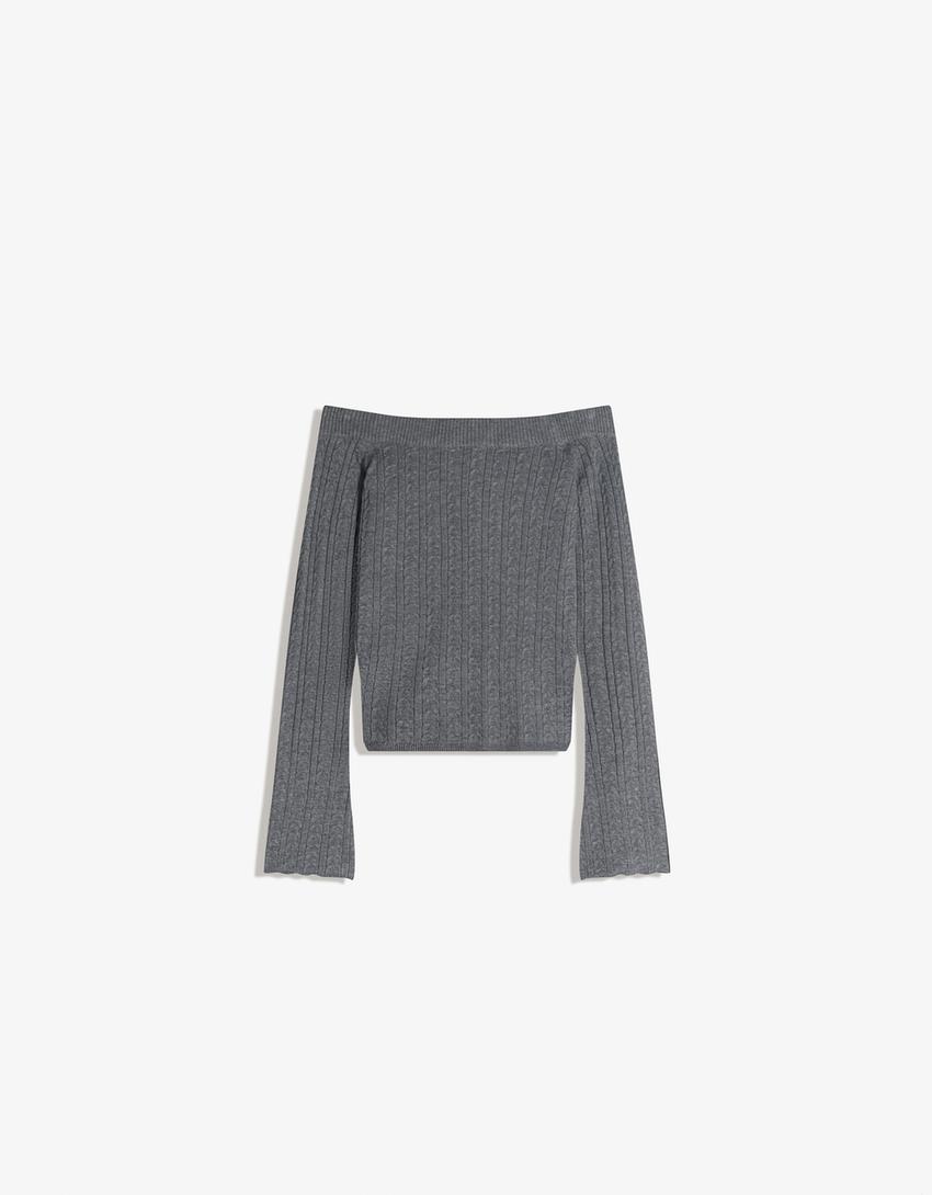 Pynių rašto megztinis su pečius atidengiančia tiesia iškirpte