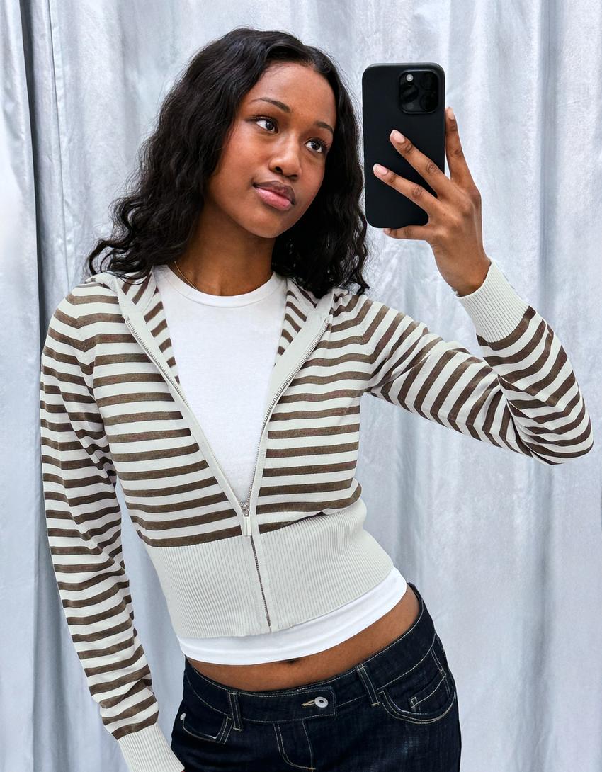سويت شيرت مقلم بسحاب وغطاء رأس