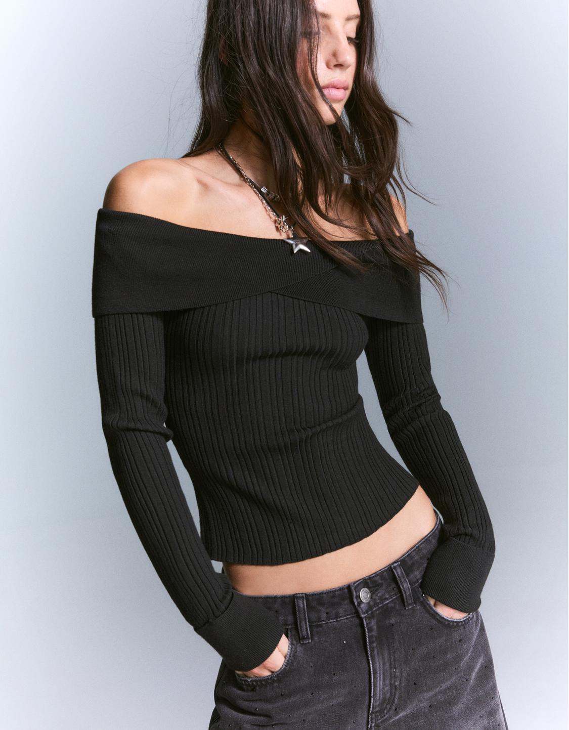 Asymmetric sweater with ribbed hem