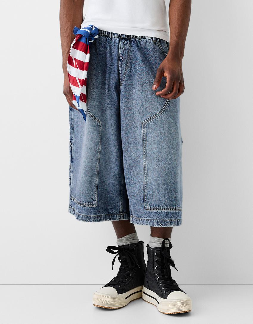 Calções bermuda jort denim baggy cintura contraste