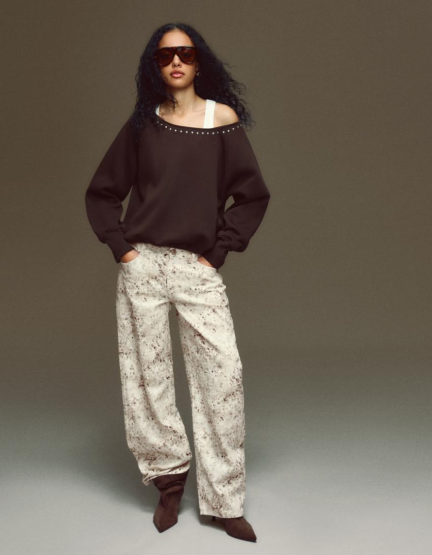 Low-rise baggy jeans with a textured print