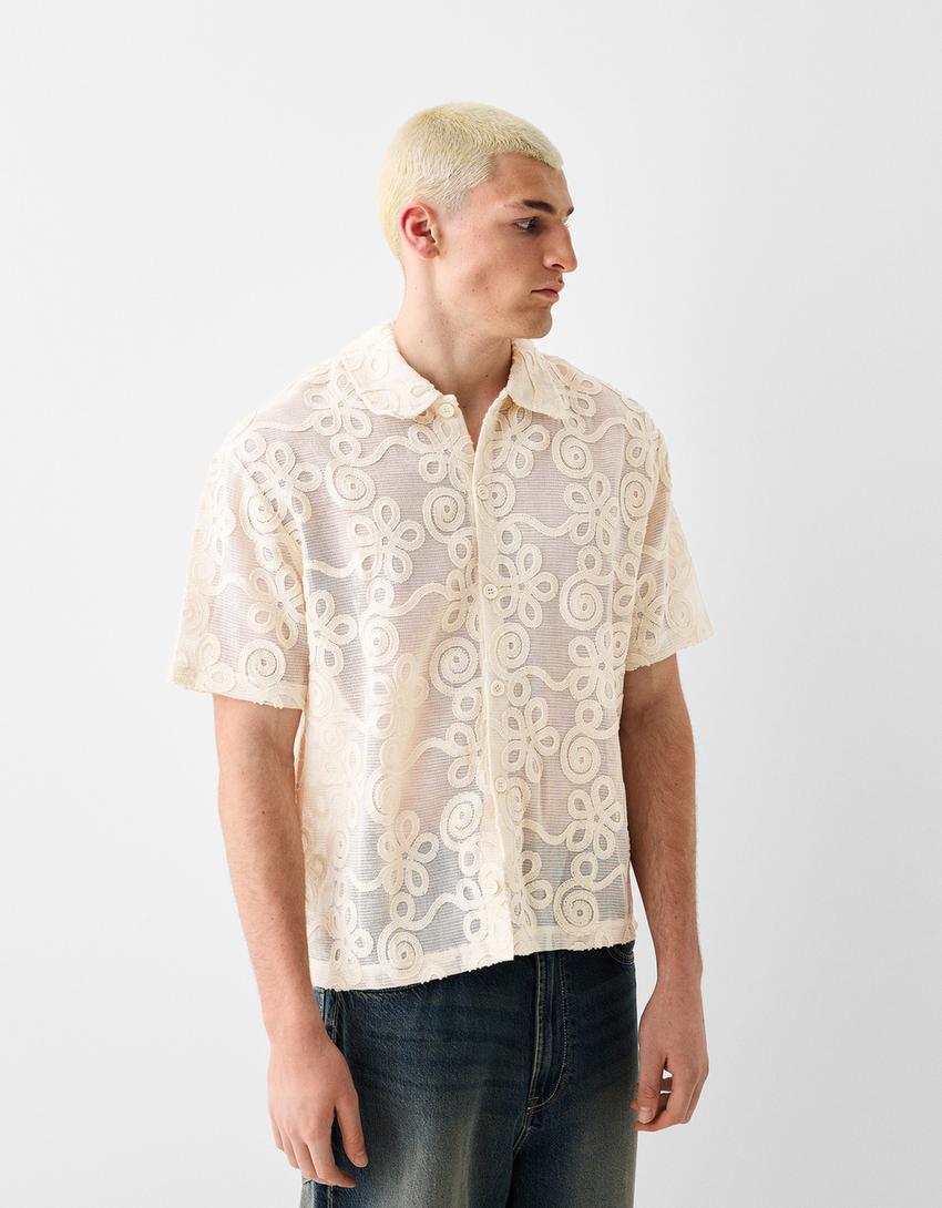 Kısa kollu dokulu çiçek desenli gömlek