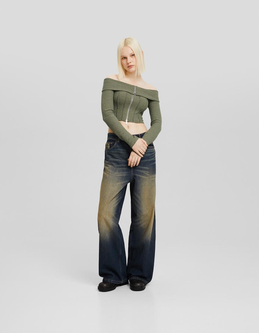 Fermuarlı düşük omuzlu triko hırka