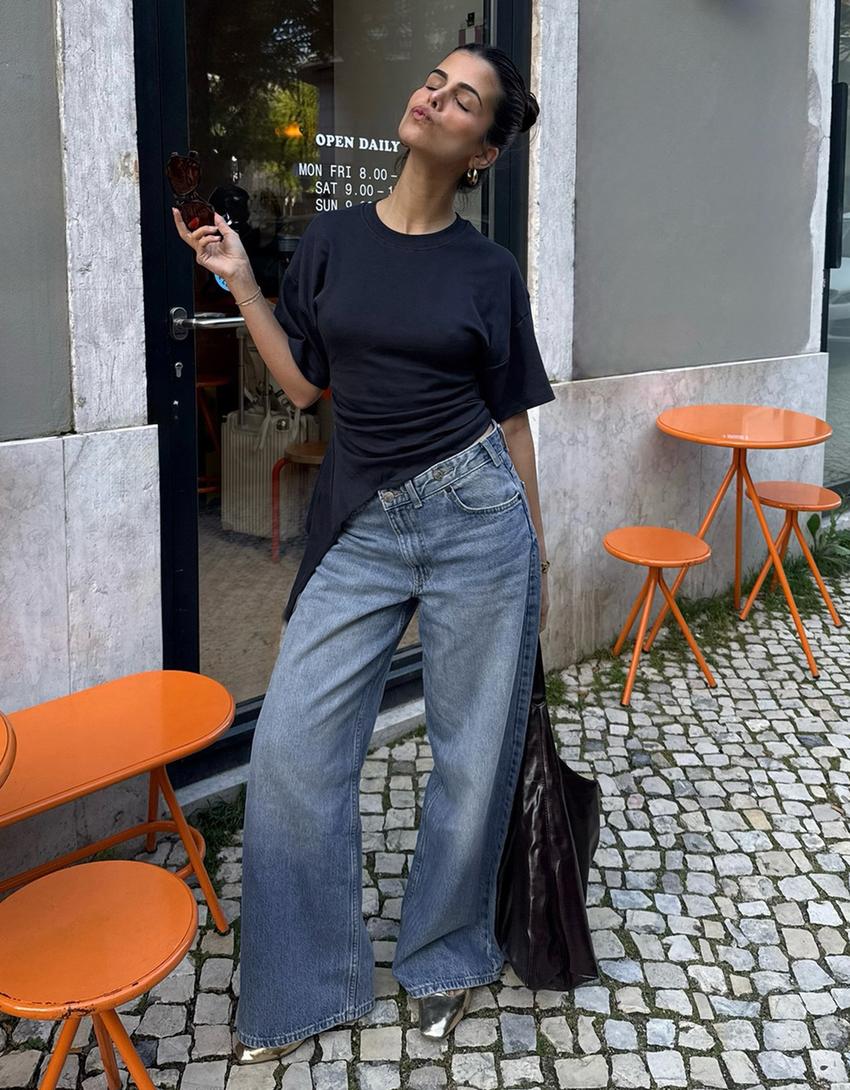 Jeans perna larga cintura subida cruzada