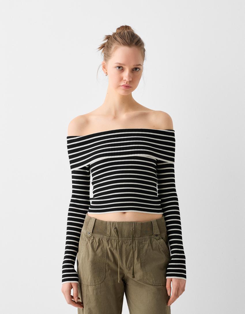 Camisola bardot com dobra e riscas
