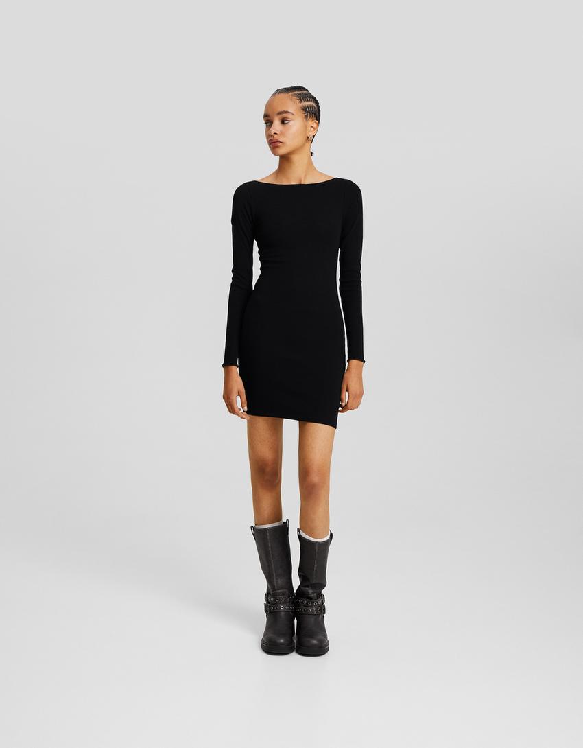 Vestido mini de manga comprida com decote barco em malha com nervuras