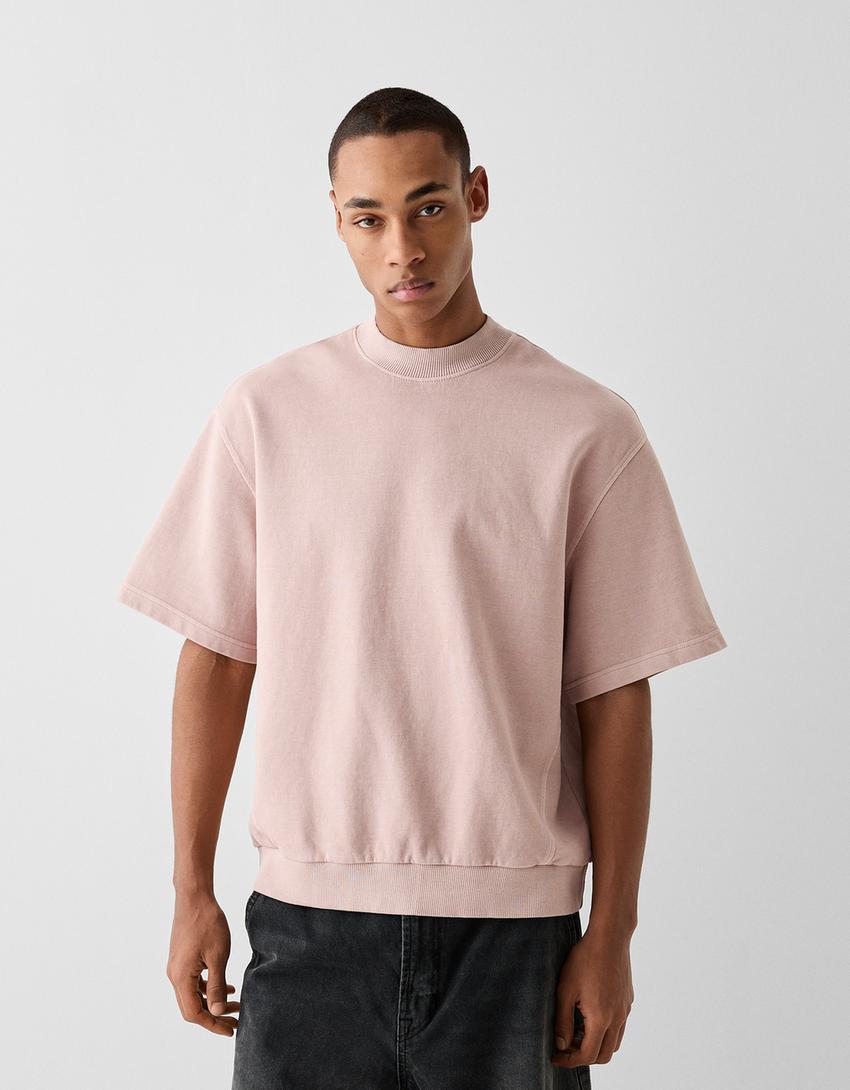 Short sleeve faded-effect plush T-shirt with interlocking and ribbed trims