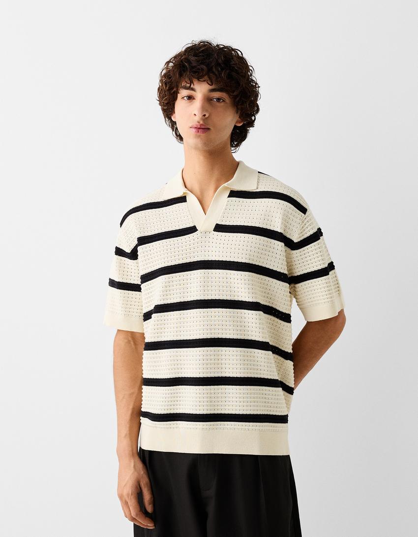 Textured striped short sleeve polo shirt
